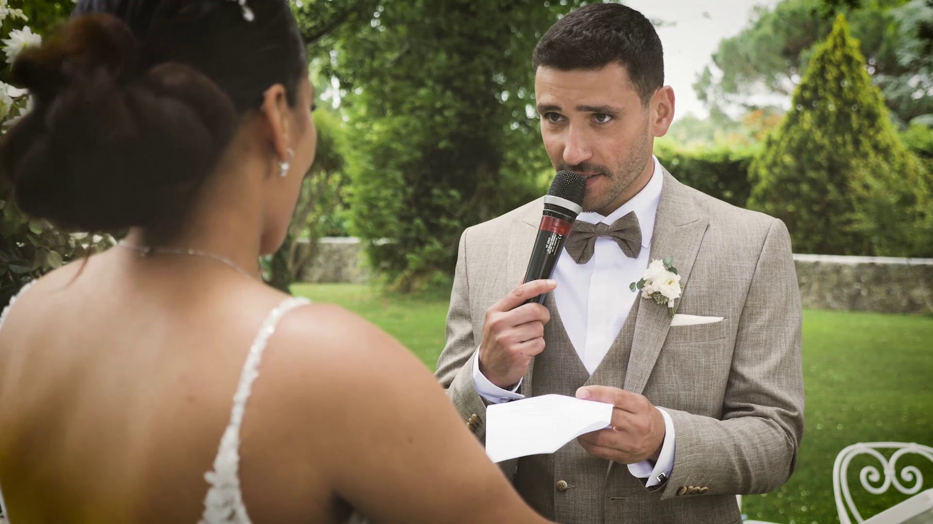 La cérémonie est pleine d’émotion. Cela se ressentira forcément dans le film final. J’ai réussi à capter quelques larmes et beaucoup de rires. Il faut dire que les discours des témoins et des parents des mariés y sont pour beaucoup. Avec ma caméra, je filme l’intégralité de chaque discours, en essayant d’obtenir différents plans. Entre deux plans, je peux compter sur une deuxième caméra, que j’ai posé sur un trépied (et qui filme l’intégralité de la cérémonie) pour lier l’ensemble des plans au besoin. De ce fait, je parviens à avoir des plans larges et serrés afin de donner un peu de relief au montage final, qui s’avèrera être un long travail, notamment dans le choix des plans vidéos mais aussi des extraits de discours que j’aime mettre en avant dans le film.