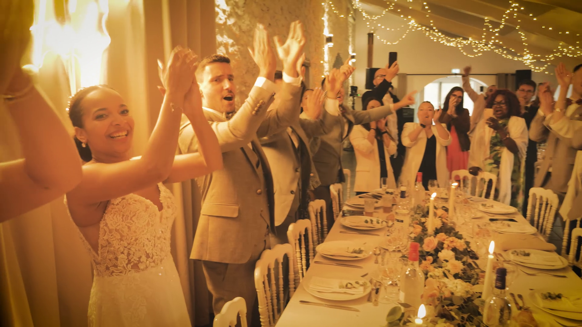 Vînt ensuite le temps de rentrer dans la salle pour le dîner. Les témoins et filles et garçons d’honneur ont préparé une petite chorégraphie pour l’entrée des mariés. Une vraie réussite qui enflamme déjà la salle. Et dire que ce n’est que le début… Car l’ambiance ne fera que monter. Si une vidéo d’une dizaine de minutes retracera le parcours de Natacha & Julien et fera jaillir de multiples émotions, la fête ne sera ensuite que plus belle avec la pièce montée arrivée sur du Daft Punk et sous les cris et applaudissement de toute la salle.